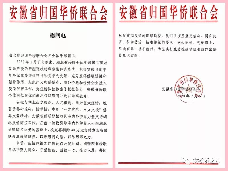 慰问电说:安徽与湖北山水相连、人文相通。面对重大疫情,皖鄂侨界心连心,情牵情,本着“一方有难、八方支援”侨界友爱精神,安徽省侨联积极动员海内外侨界力量支持湖北疫情防控工作。在前一阶段引导海内外侨界人士向湖北捐赠防控物资的基础上,决定再捐赠40万元支持湖北省侨联开展疫情防控,以表慰问之意,以尽绵薄之力。