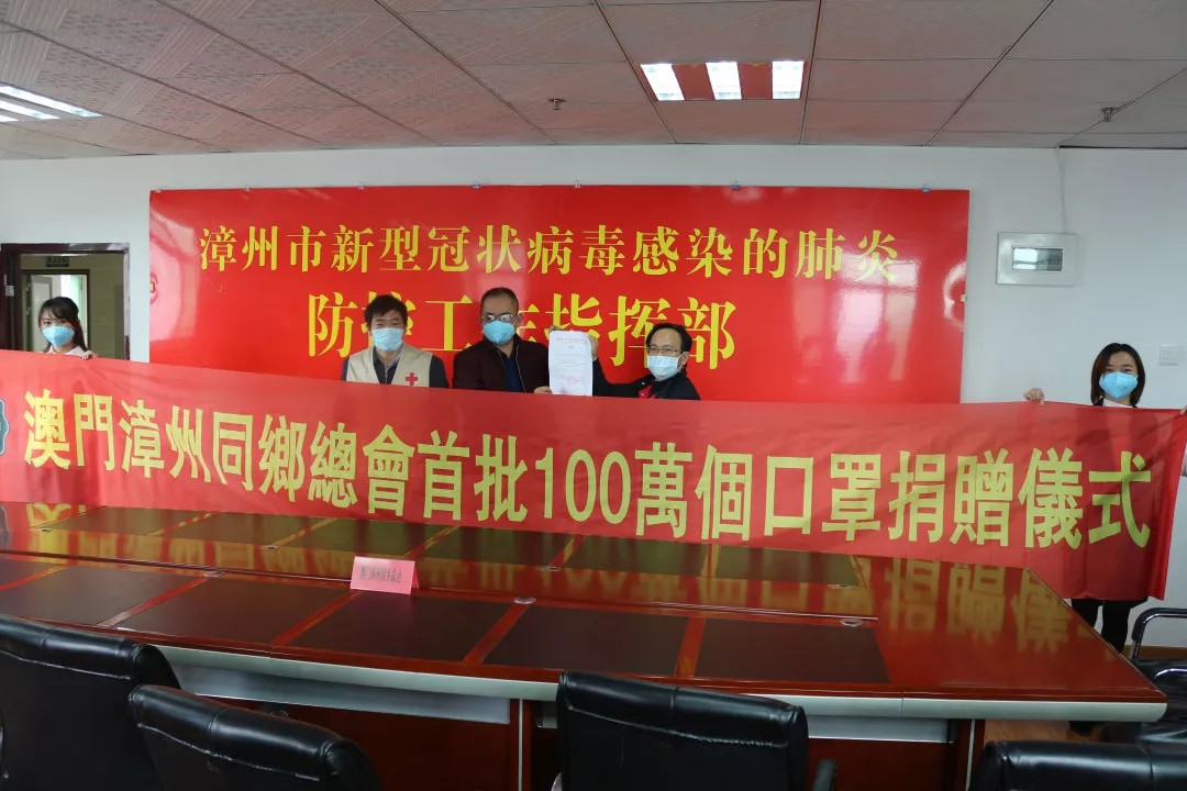2月6日上午10点,澳门漳州同乡总会首批100万个口罩捐赠仪式于西城大厦漳州市卫健委7楼“新型冠状病毒感染肺炎防控指挥部”举行,红十字会副会长方景伟、市侨办许主任、巿区医疗资源保障部负责人出席捐赠仪式。