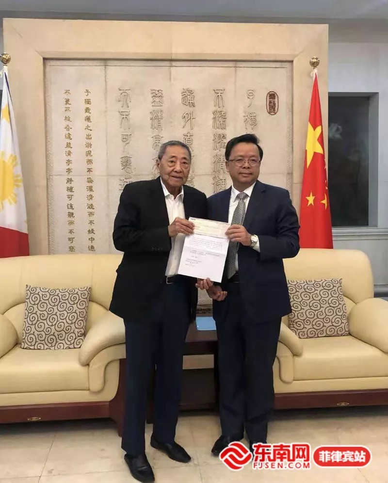 中国驻菲律宾大使黄溪连(右一)与菲律宾宋庆龄基金会创会会长陈祖昌(左一)捐赠合影。菲华社团供图