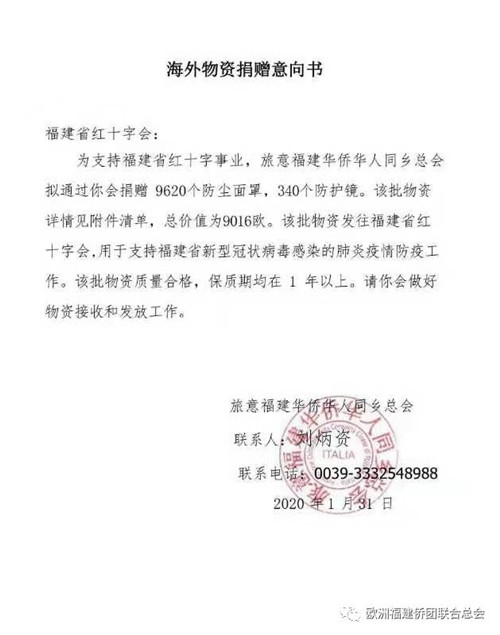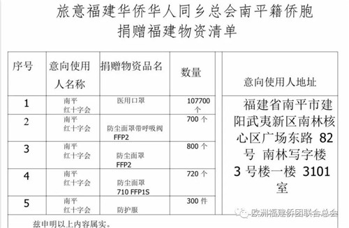 旅意福建华侨华人同乡总会积极响应倡议书,会长刘炳资迅速组织会员购买物资分两批发往福建,旅意福建华侨华人同乡总会南平地区侨胞积极响应南平市政府、南平市侨联的号召,将这批防疫物资将捐赠到南平市红十字会,支援家乡人民抗击疫情。据悉此次采购捐赠南平地区的医疗物资由以下几位意大利南平籍侨胞共同捐助:陈天明(建阳),胡建兵(邵武),邱伟(建阳),徐金华(建阳),郑海龙(建瓯),王松强(建阳),蔡玉旺(建阳),陈茜(建阳),吴光平(松溪),王建华(浦城)共同捐助,运输由黄清凯(建阳)负责协助,在2020年1月30日,通过东航工作人员运输回南平,其中欧福联轮值主席、旅意福建华侨华人同乡总会荣誉会长胡建兵还单独为家乡邵武市捐赠防控疫情的物资。另外一批援助物资,也在运往国内的路上。