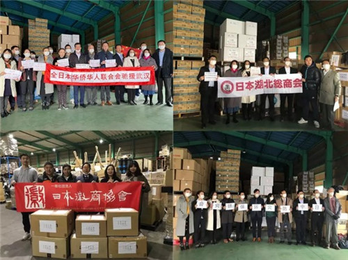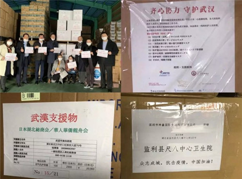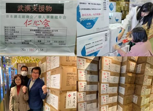 与此同时,日本各大侨团的也纷纷慷慨解囊、捐款捐物,为抗疫工作全情奉献。日本川渝总商会、日本湖北总商会、日本黑龙江总商会、日本浙江总商会、日本徽商协会、日本安徽联谊会、中国旗袍日本总会、日本深圳经贸文化促进会、日本福州十邑社团联合总会、日本海南商会、日本海南同乡会、日本陕西同乡会、在日天津同乡会、日本天津总商会、日本江西总商会、千代田教育集团、一般社团法人国际教育机构评议会、同源中文学校、在日华人女性交流会、日本华侨华人创美协会、全日本中国人博士协会、中华太太日中文化交流联合会、日本华侨华人妇女联合会、日本泉州商会、日本华侨华人博士协会、日本陕西总商会、在日科技工作者联盟、日中介护学会、医博会、防灾环保研究会、中部日本华侨华人联合会、日本吉林总商会、中国留日同学会、北京同乡会、日本甘肃总商会、日本福建长乐同乡会、东南大学日本校友会、日本山西总商会、日本山西同乡会、长乐同乡会、北京理工大学日本校友会、北京工业大学校友会、日本广西同乡会、日本重庆同乡会、武汉大学日本校友会、日本中国留学生交流会、日本中华总商会、北海道中国会、吉林大学日本校友会、日本北京总商会、日本山东总商会、在日中国厨师精英协会、华人华侨龙舟协会、日本湖北同乡会、日本买手联盟、日本华商经济文化促进会、日本中国长三角一体化促进协会、日本江苏总商会等等侨团(排名不分先后),捐献了近百万只N95、医用等各规格口罩,数万套防护服,千余套防护眼镜,还有消毒液、消毒粉等各类抗疫救援物资。