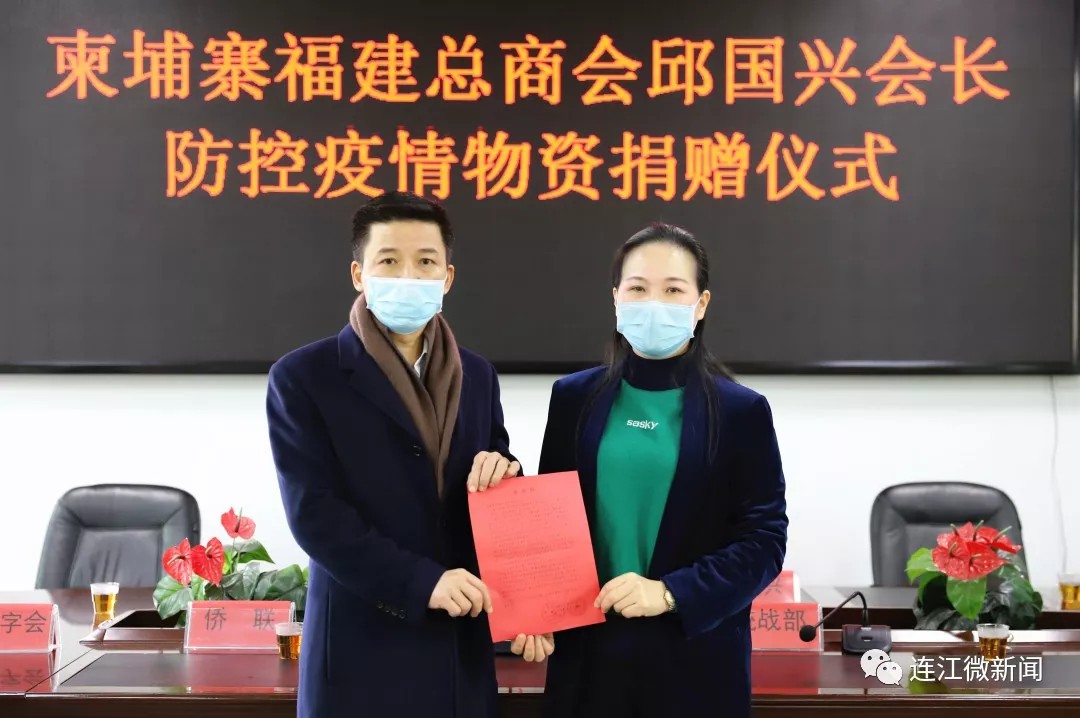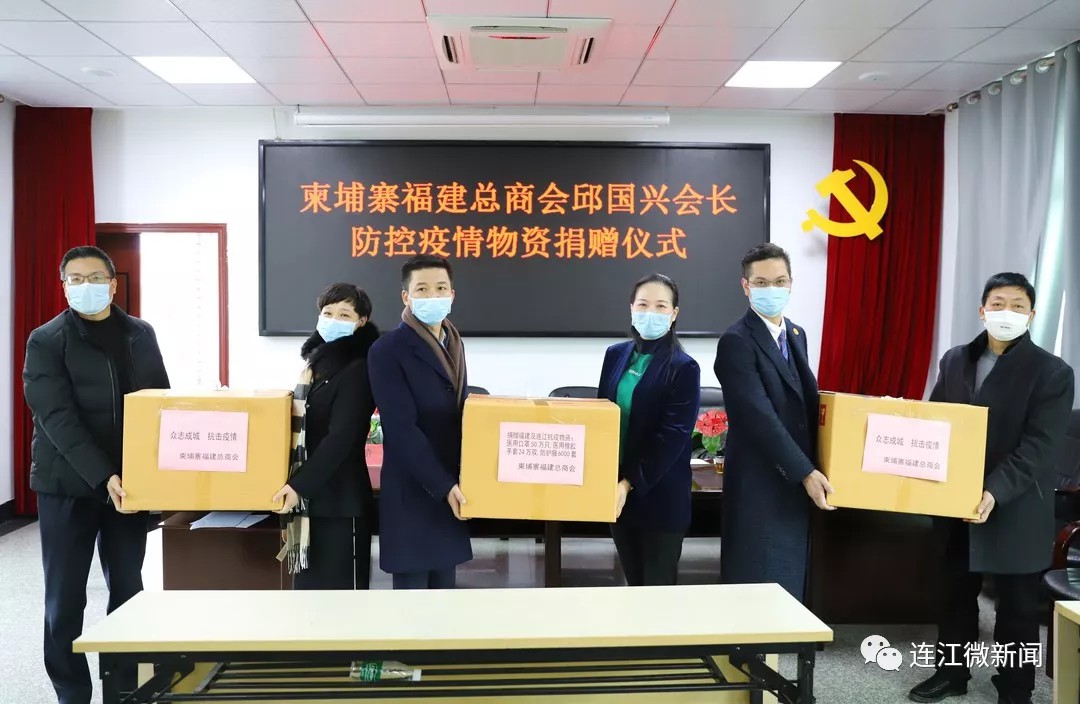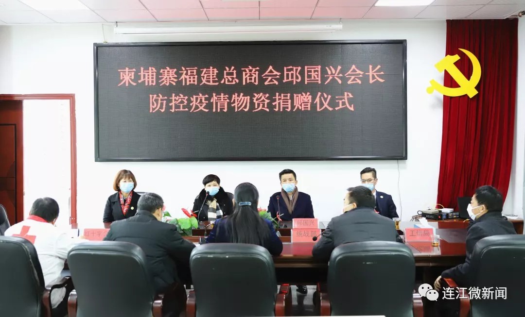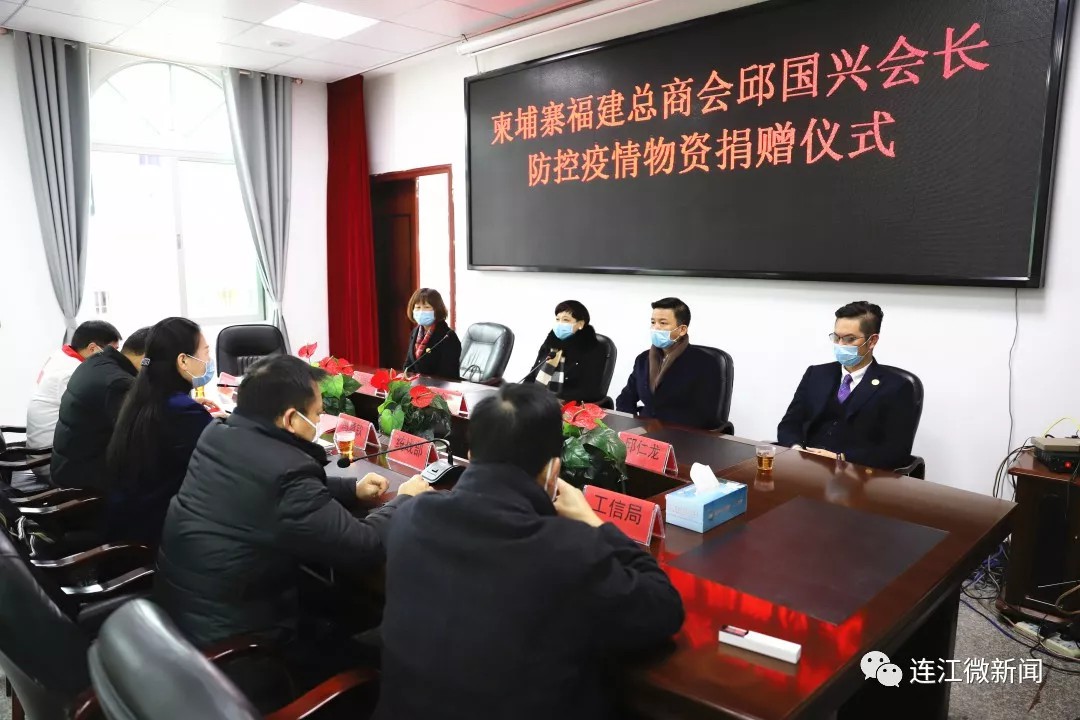 2020年2月9日上午,柬埔寨福建总商会邱国兴会长防控疫情物资捐赠仪式在县工信局举行,县委常委、统战部部长冯慧钦、县工信局、侨联、红十字会领导以及柬埔寨福建总商会会长邱国兴等华侨代表出席捐赠仪式。
