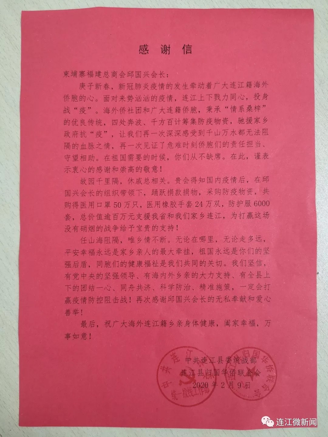 疫情发生以来,连江统一战线各界人士纷纷行动起来,积极捐款捐物,支援家乡疫情防治工作。截止2月8日下午四点,全县统战系统已到位善款1190多万元,已到位防护服、口罩等物资85.97万件。
