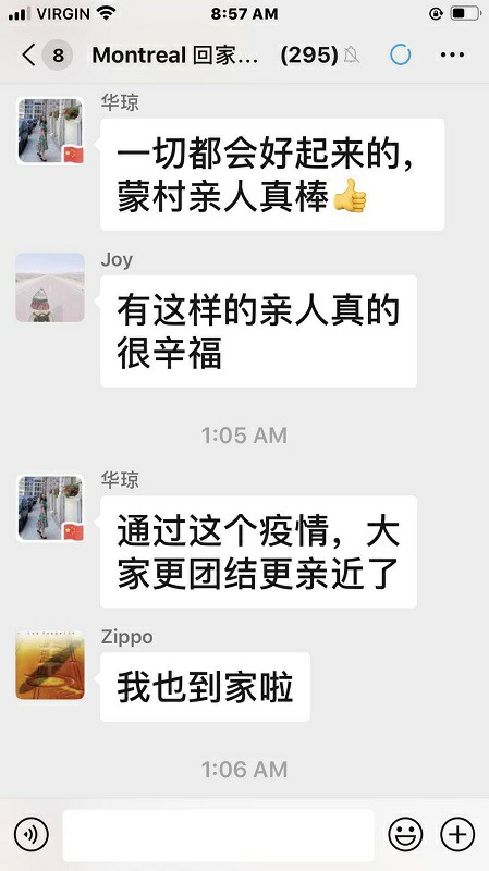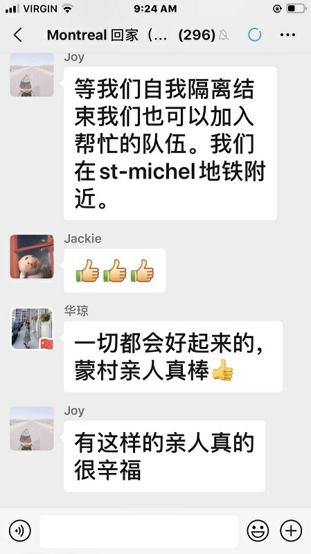 2月3日记者报道了率先成立的“Montreal回家(加)隔离互助群”,目前接龙已达到极限,不得不启用群公告功能,而类似的互助群本市已不下五个(不完全统计)。在加拿大的其他城市,如温哥华、多伦多、渥太华也都有相同的群体。志愿者们在群里踊跃接单,群策群力,分工合作、服务周到,相互鼓励,亲如家人;有的志愿者在多个群报名,争先恐后;有的群合并在一起,互通信息。他们的行动不仅受到从中国回来的同胞们的感激和赞扬,也受到主流媒体的报道和点赞。