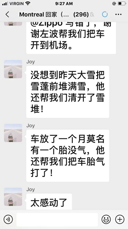 前天和昨天,蒙特利尔漫天飞雪,街道边,房屋前都堆起了没膝的“白墙雪山”,有的学校宣布停课,有的公司让员工在家里上班。可是我们的志愿者却照样出车,去机场接机,去帮助在家隔离的同胞买菜送饭。浏览互助群,你可以看到志愿者接龙越来越长,工作做得越来越细,他们不仅频频发布隔离者须知、志愿者注意,还设身处地为舟车劳顿的归来者预备一周的所需,为两眼一抹黑的新移民寻找临时隔离住所,提供各种落地信息……