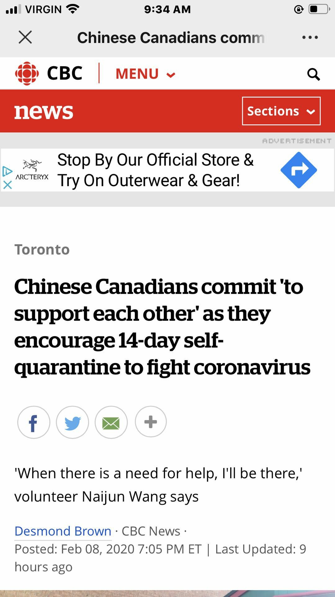 2月8日,加拿大广播公司以“加拿大华人承诺‘互相支持’,以鼓励 14 天的自我检疫与冠状病毒作斗争”为题,报道了加拿大华人这一史无前例的壮举。