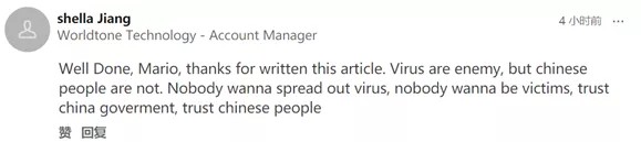 “真棒,马意骏,谢谢你写这篇文章。病毒是敌人,但中国人不是。没有人想传播病毒,没有人想成为受害者,相信中国政府,相信中国人民。”
