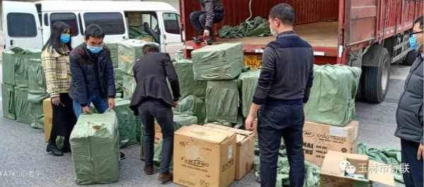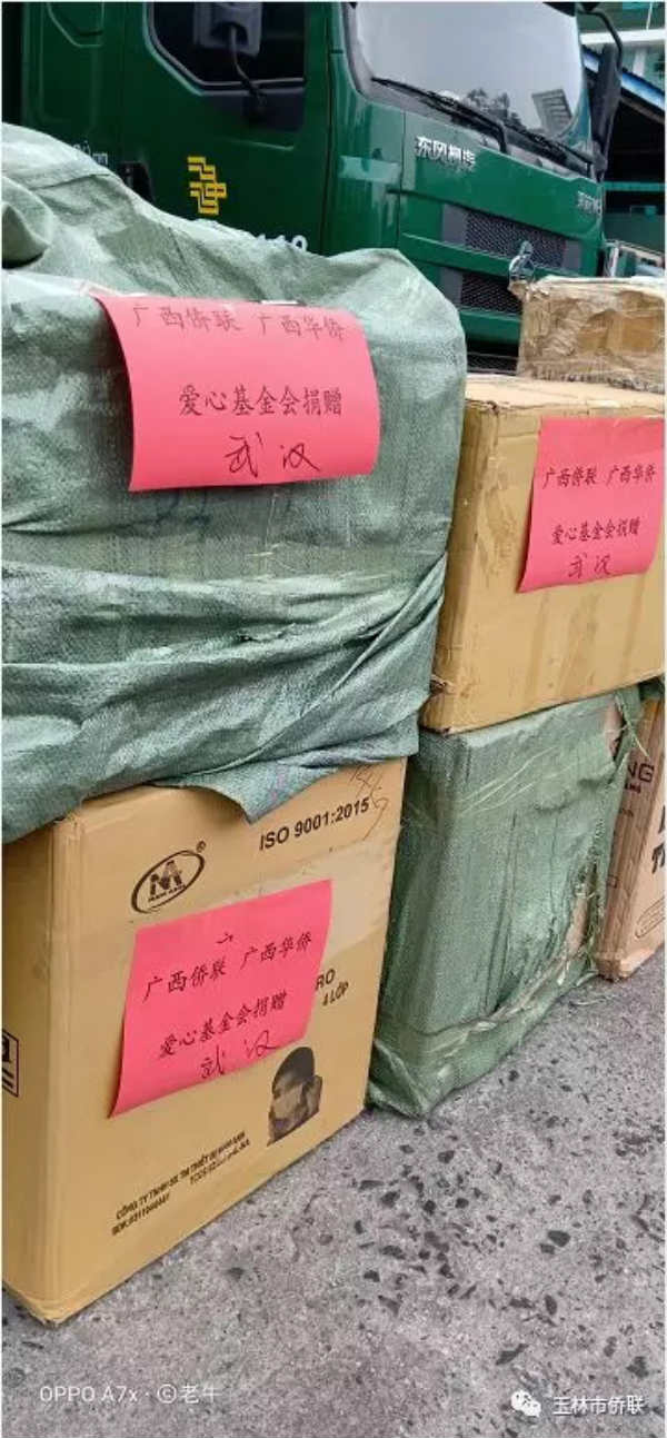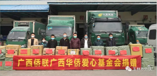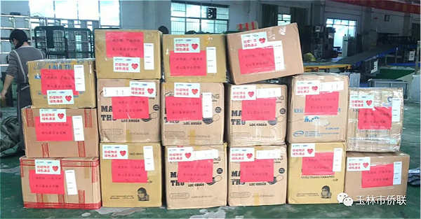 11日中午, 广西区侨联、广西华侨爱心基金会委托老挝广西商会代购的40000个医用口罩从深圳海关出关直达玉林。广西侨联副主席、玉林市侨联主席杨志光和玉林邮政公司负责人到场发运,通过绿色通道免费直寄武汉广西援鄂医疗队,支持战疫一线。