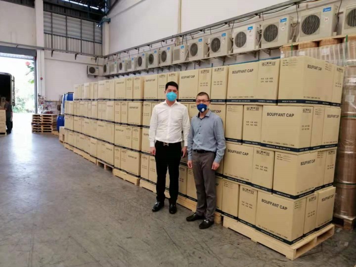 我会副会长、泰国浙江商会会长祁晓云代表泰国浙江商会捐赠医用帽子5万个、医用手套10万双、护目镜1000副、防护服1000套等物资,总价值为(101万泰铢)人民币23万元。