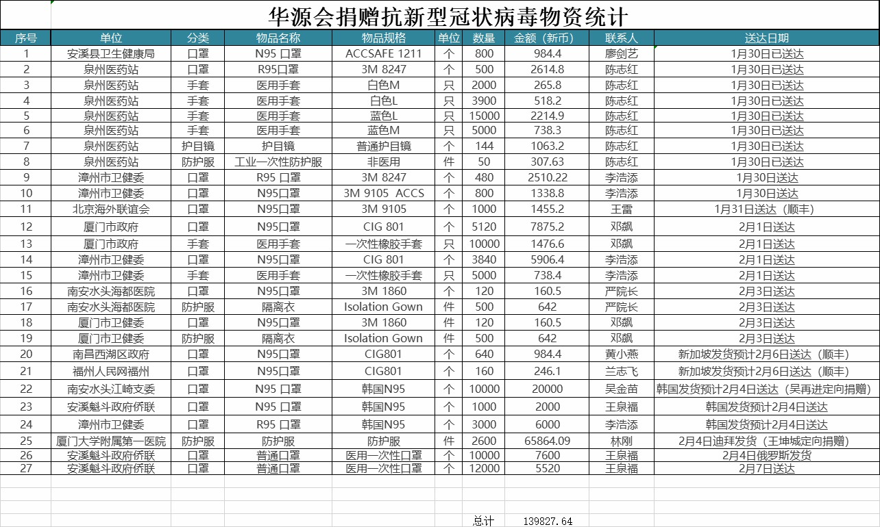 1月31日,新加坡航空及胜安航空官方微博发布消息,鉴于新型冠状病毒肺炎疫情的状况,新加坡航空及胜安航空于2020年2月,取消部分中国大陆航线航班的运营。而在新加坡停飞中国航班之前,王泉成和他的“战友”们早已筹集大批医疗物资运抵厦门。