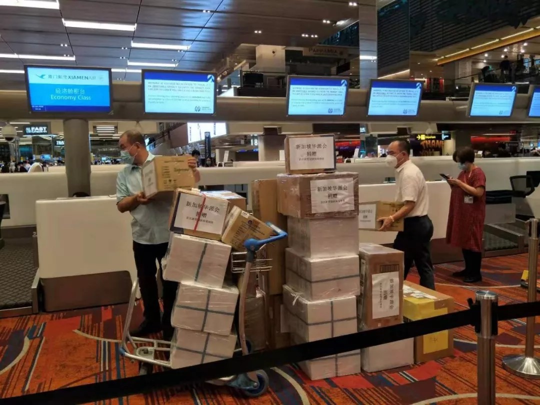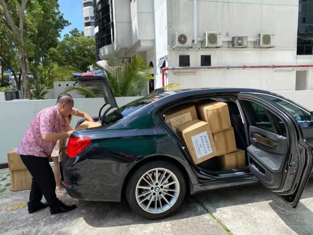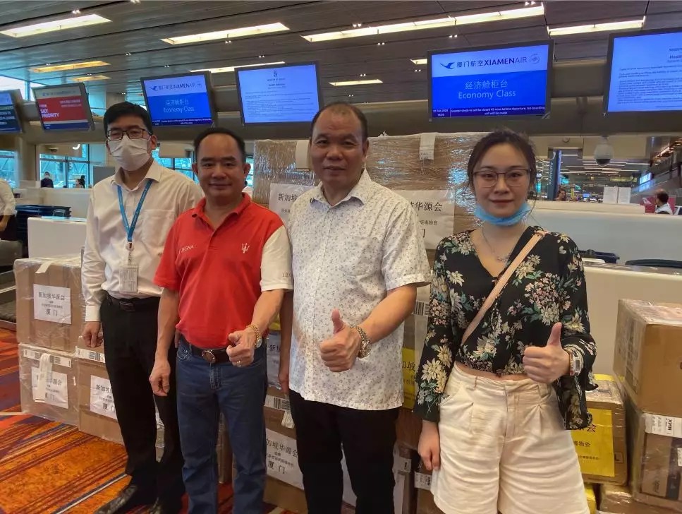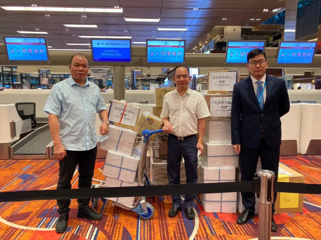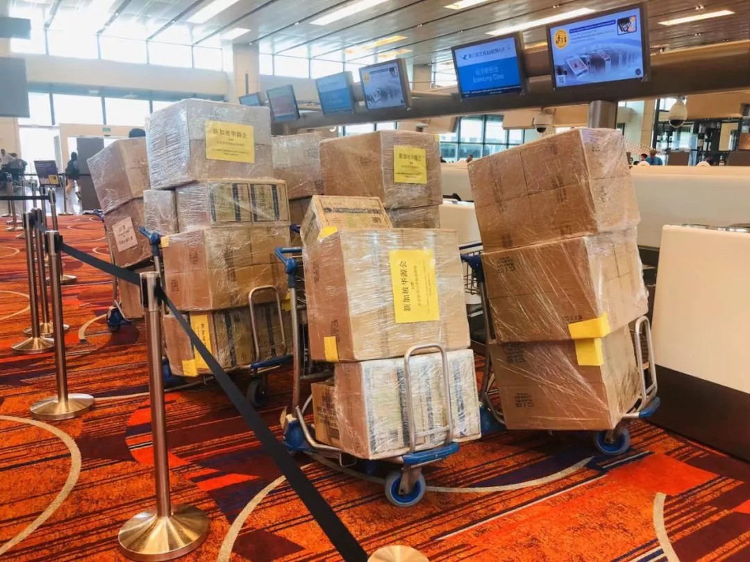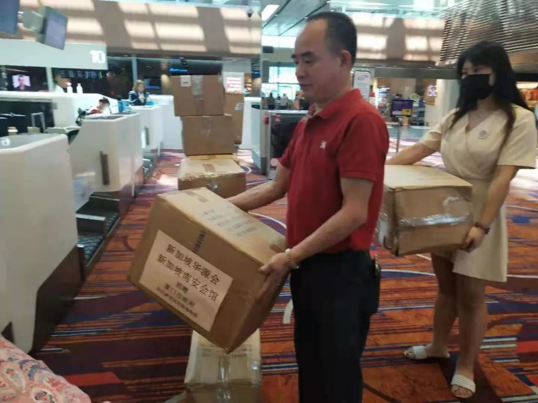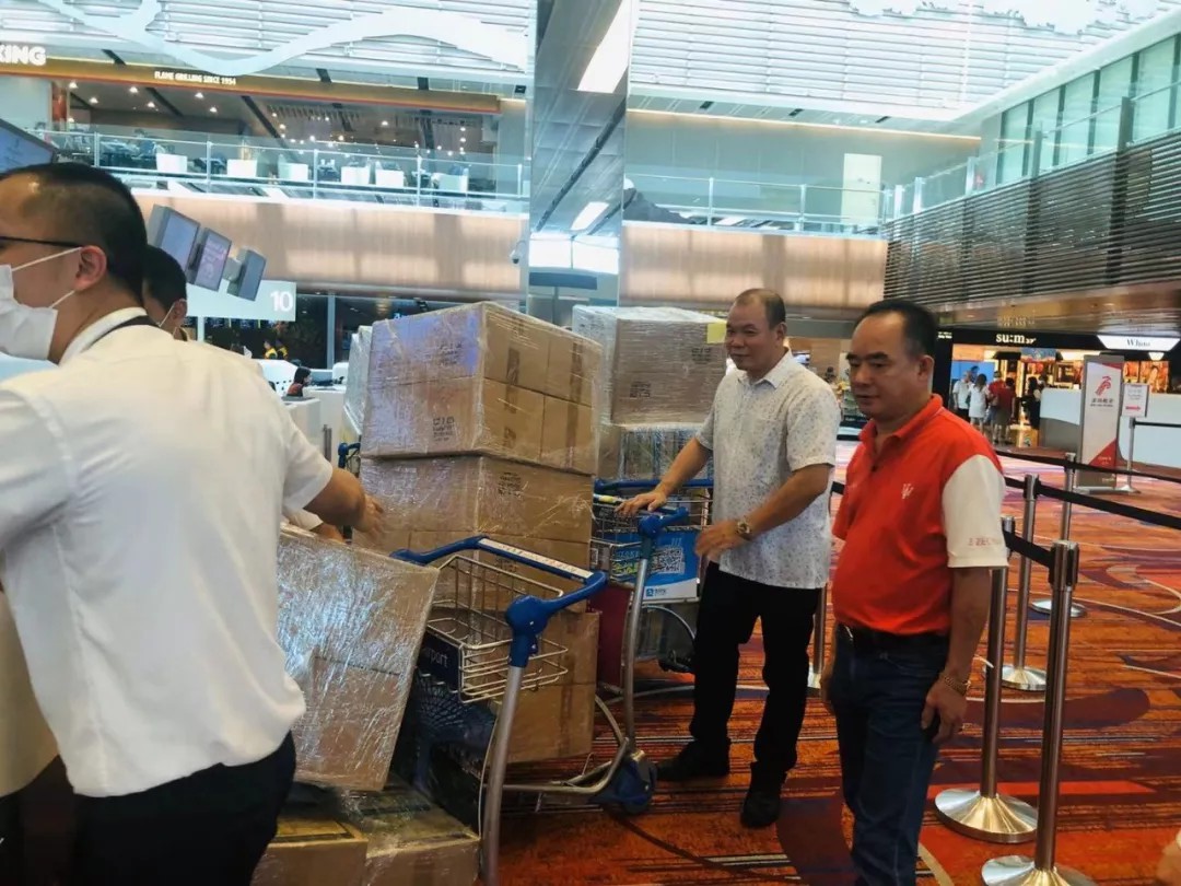 事无巨细,王会长全程协调,亲力亲为,在新加坡机场请航空公司帮助免费托运行李,飞机落地后,王会长又特别委托安排机场地勤工作人员对接每一批物资,协助取出并分配,保证第一时间送达。打通了第一条最高效、最特别的“绿色通道”。