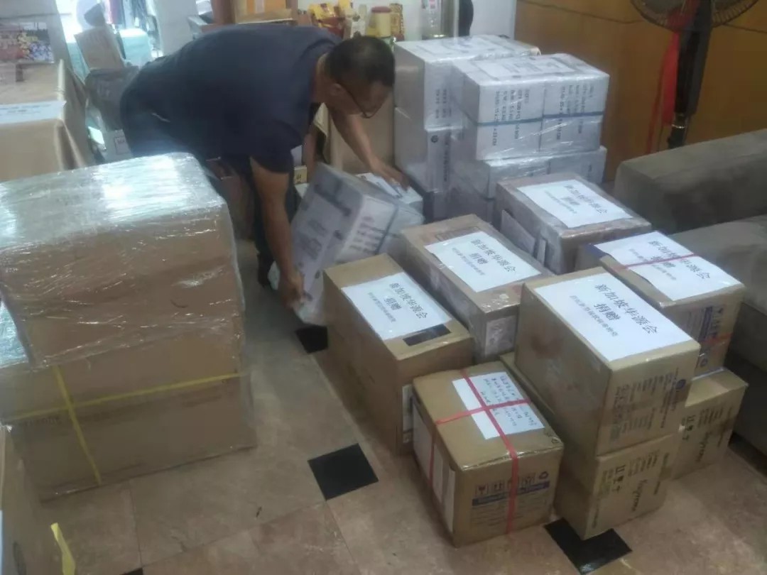 采购回来的一批批物资将华源会会所办公室占满,会员们协助打包:
