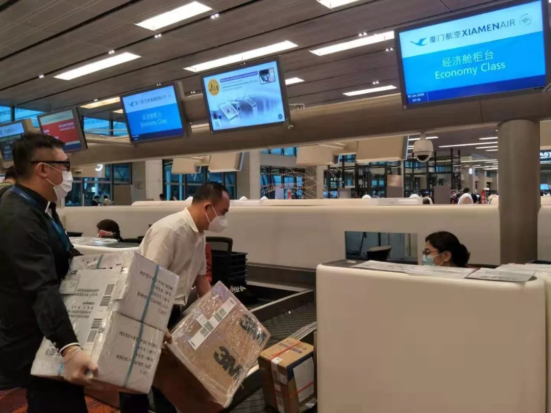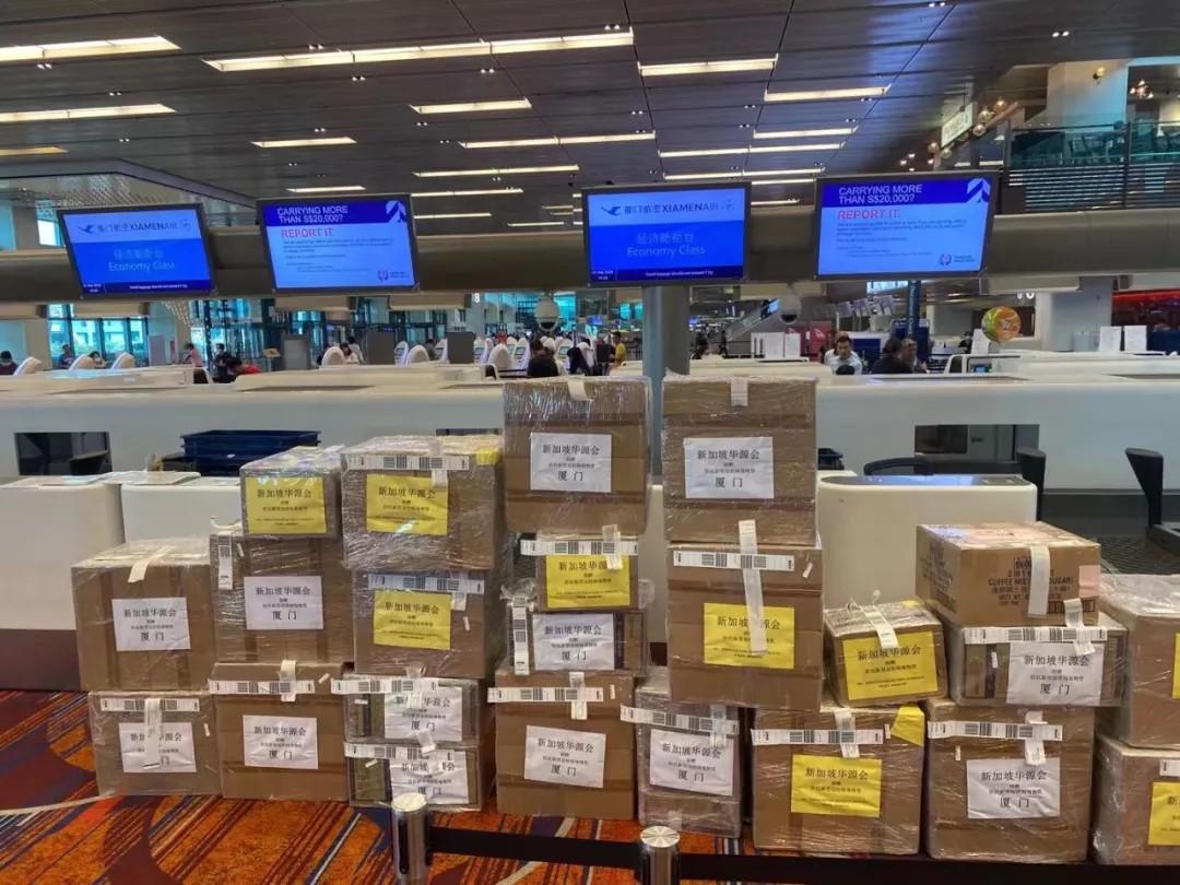 2月3日 下午,第三批物资赶上最后一班飞机离开新加坡(近日,飞往中国的航班大面积取消,各线航班减少到每天只有1-2班,直到2月6号以前,没有航班再前往厦门了):