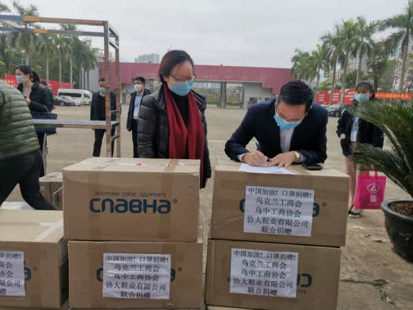 广东省侨联委员张智强、台商江文宏发动捐赠、乌克兰中国工业商业协会帮助在乌克兰采购了10万个医用口罩,肇庆市鼎湖区委书记陈宇航,鼎湖区副区长陈伟庆在春节期间仍然关心医用口罩的供应。