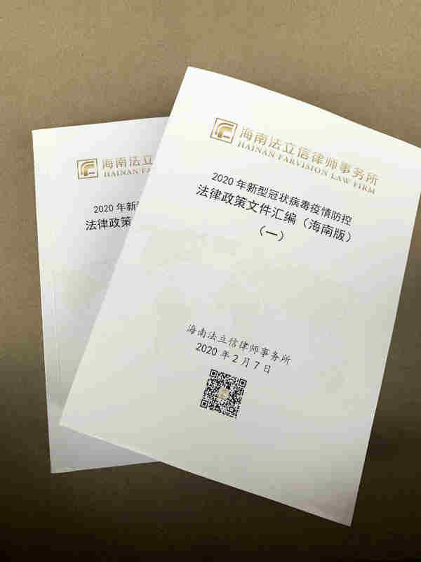 海南省侨联法顾委律师团多名骨干律师参加编印了《2020年新型冠状病毒疫情防控法规政策文件汇编(海南版)》,对疫情相关的法律法规和政策文件进行了梳理和摘要,并分别对卫生健康、医疗、应急管理、民政、交通运输、教育、人力资源和社会保障、市场监督、海关、公安、生态环境、住建、商务、税务、金融、文旅、财政等相关部门的文件予以分类,第一期共计汇编文件150多件,17万多字,包括《中华人民共和国传染病防治法》《突发公共事件应急条例》《关于印发近期防控新型冠状病毒感染的肺炎工作方案的通知》等,方便各级政府部门和各相关单位在当前疫情防控工作中查阅使用,为依法做好疫情防控工作提供强有力的法律支撑。