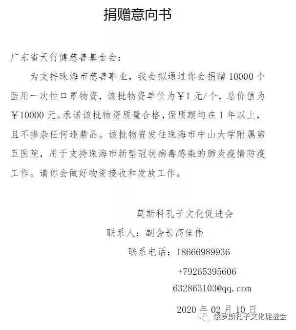 自新冠肺炎疫情爆发以来,身处俄罗斯的各个华人社团和广大华侨华人同胞、留学生都发挥各自优势,通过不同渠道和方式纷纷向国内捐款捐物。俄罗斯孔子文化促进会、莫斯科孔子饭店、俄罗斯华人军旅情怀联谊会的各位领导,首先带头筹集资金、采购防疫用品,在没有开通正常物流渠道的情况下,通过“人肉”方式把第一批30000多只医疗口罩和部分防护服分别带往上海、珠海和山西等地。