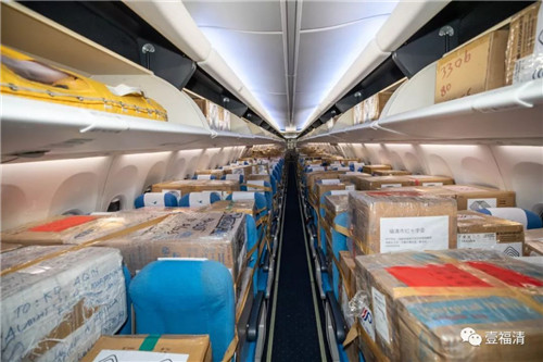 通过摄影师的镜头,我们看到令人震撼的一幕:一个个大纸箱把客舱和货舱“坐”得满满当当。据了解,这些纸箱里装着118万只口罩以及防护服、手套、护目镜等防疫物资,共900余箱,6888公斤。