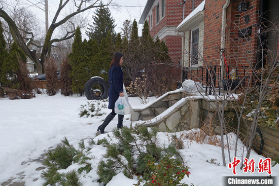 当地时间2月10日,微信群“多伦多爱心互助隔离同胞群”的“群主”孙女士帮多伦多一位正在自我隔离的孕妇采购食物和生活用品后,将物品送至对方居所门外。 中新社记者 余瑞冬 摄