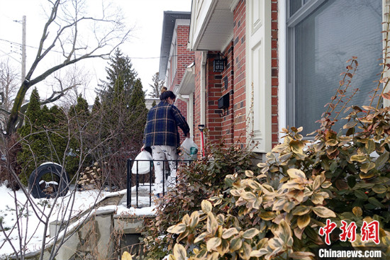 当地时间2月10日,多伦多一位正在自我隔离的孕妇将“隔离互助群”义工帮助采购的食物和生活用品拎进屋内。 中新社记者 余瑞冬 摄