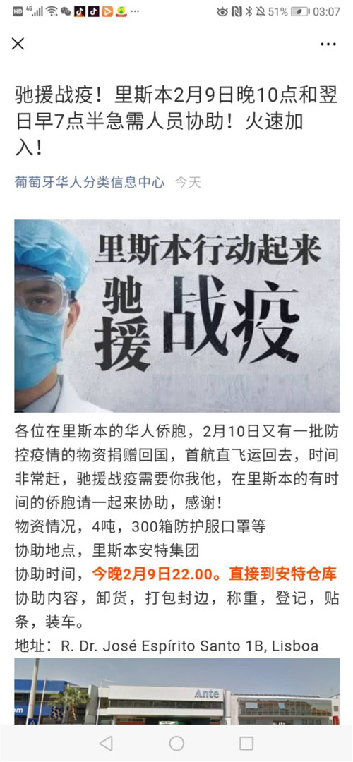 葡萄牙里斯本侨胞刘建云在获悉省侨联西班牙第二批物资因航班临时取消必须分流至葡萄牙里斯本却面临物流运送困难的信息时,二话不说,立刻在微信群里吹响集结的号角:“由西班牙华人侨胞募捐筹集的20吨防护服、护目镜和口罩等医疗物资,紧急转运葡萄牙交付首都航空中葡直航航班托运回国,当晚22:30分急需人手卸货、打包、装车。有空的侨胞请接龙报名!”群里一呼百应,瞬时超员。当晚就将西班牙运送过来的捐赠物资进行重新打包直至深夜。