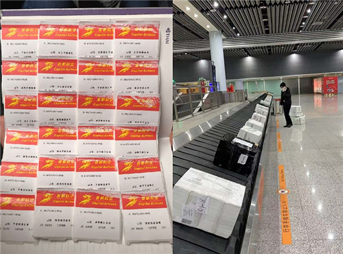 2月10日,第二批捐赠物资从葡萄牙里斯本(JD0403次航班)出发,顺利抵达西安国际机场。机上共装载了38个托盘5.5吨,124507件捐赠物资。总价值人民币1000008元。