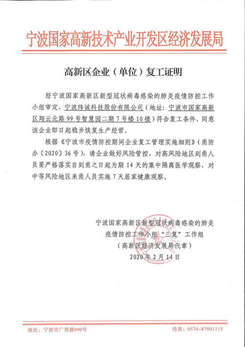 经过多日的紧密筹备,2月13日纬诚科技智慧园办公室及北仑车间顺利通过复工审核现场勘验,并在2月14日先后收到上级单位批复的复工证明,纬诚科技即将在下周一迎来激动人心的正式复工。