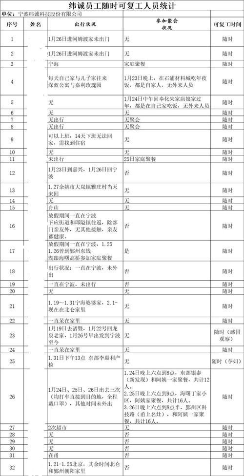 逐一梳理核对员工春节期间去向,建立员工健康情况“一人一档”,按照疫情特别严重或风险较大地区员工推迟返岗、外地返甬员工按属地政府要求隔离观察、其他返岗员工每日健康状况检查的模式,实施精确化管理,确保节后复工步稳周全。