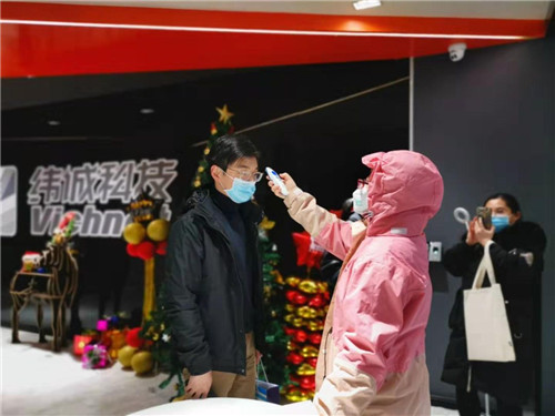 在纬诚北仑工厂入口处及纬诚智慧园办公室的入口处,均设有出入体温监控台,设专人对复工后进出工作区域的人员进行体温检测、口罩佩戴及个人防护工作的监控及提示,此外,在办公区域内张贴各种防疫提示标识,时刻提醒复工人员切实做好个人防护工作。
