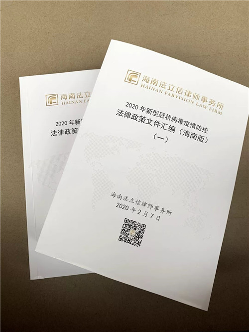 省侨联法顾委律师团多名骨干律师参加编印了《2020年新型冠状病毒疫情防控法规政策文件汇编(海南版)》,对疫情相关的法律法规和政策文件进行了梳理和摘要,并分别对卫生健康、医疗、应急管理、民政、交通运输、教育、人力资源和社会保障、市场监督、海关、公安、生态环境、住建、商务、税务、金融、文旅、财政等相关部门的文件予以分类,第一期共计汇编文件150多件,17万多字,包括《中华人民共和国传染病防治法》《突发公共事件应急条例》《关于印发近期防控新型冠状病毒感染的肺炎工作方案的通知》等,方便各级政府部门和各相关单位在当前疫情防控工作中查阅使用,为依法做好疫情防控工作提供强有力的法律支撑。