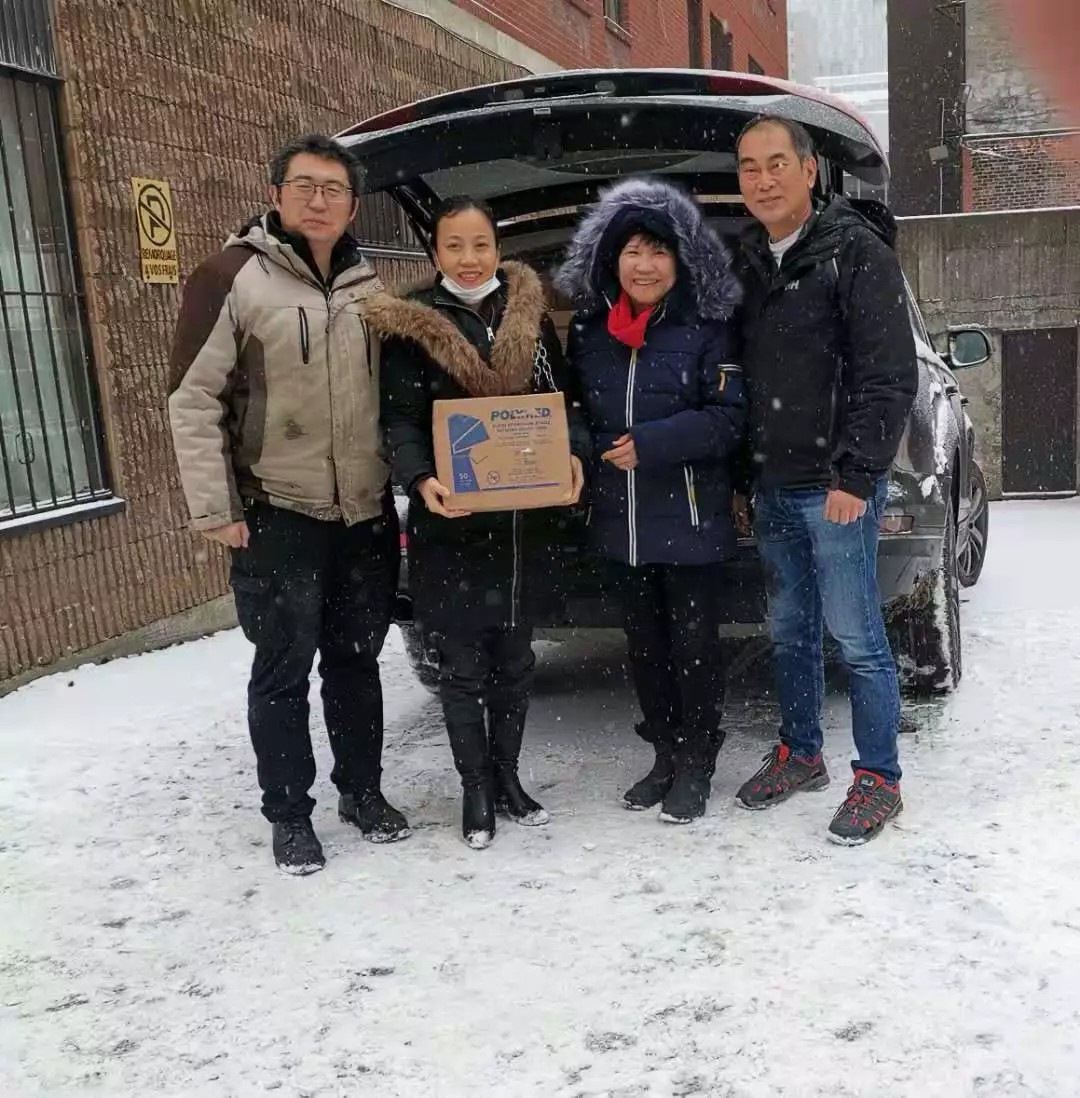 加拿大蒙特利尔海南同乡会陈婧会长(左2)与加拿大海南乡亲不惧风雪运送赠送物资