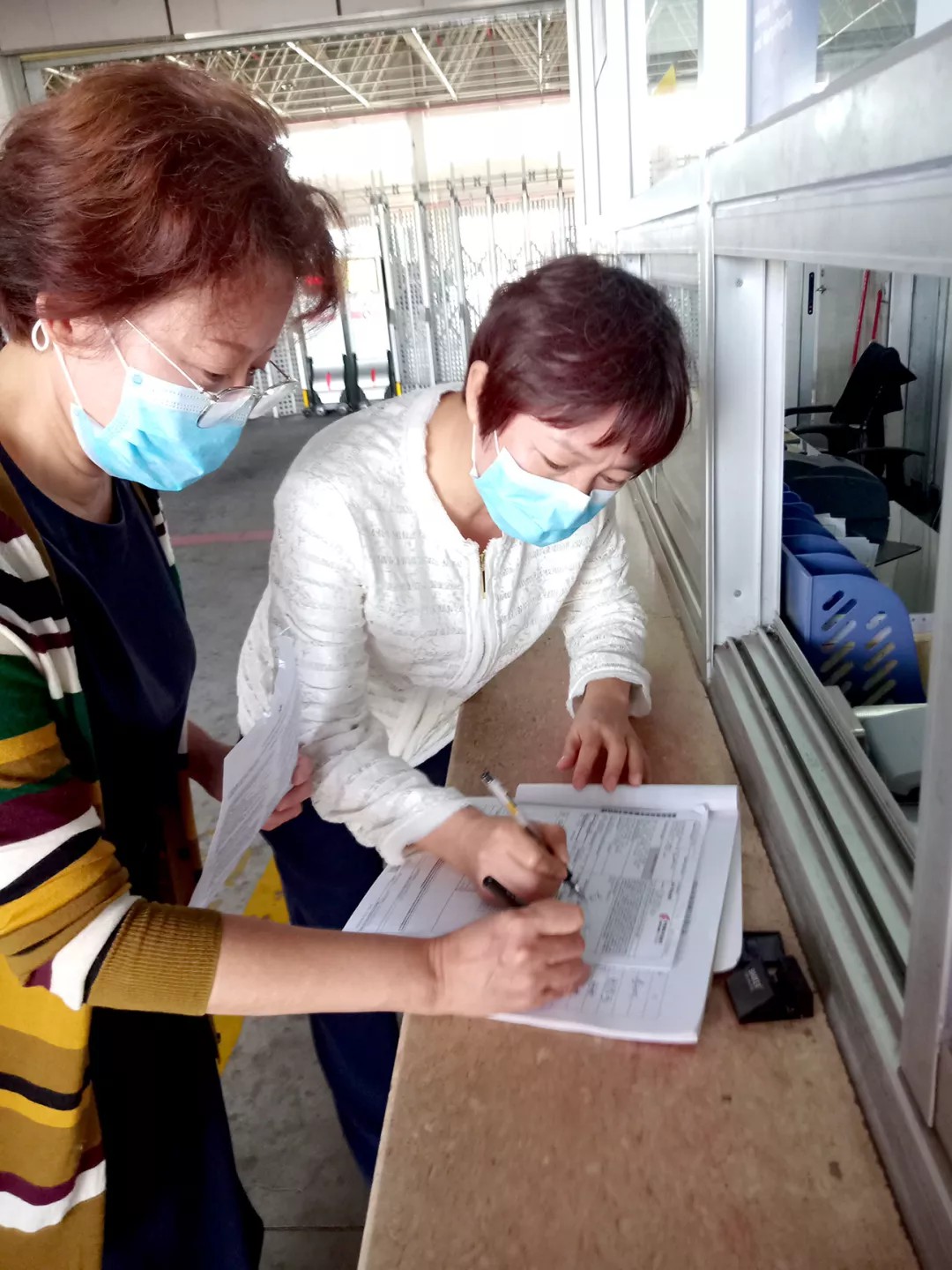 三亚市侨联主席王新(右)、市红十字会张华菊秘书长(左)办理接收医疗物资手续