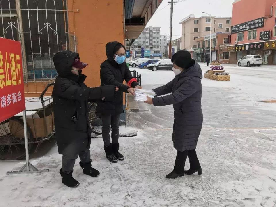 图为省侨联“侨胞之家”标兵单位-和龙市文化街道文盛社区书记崔锦玉为居民发放口罩