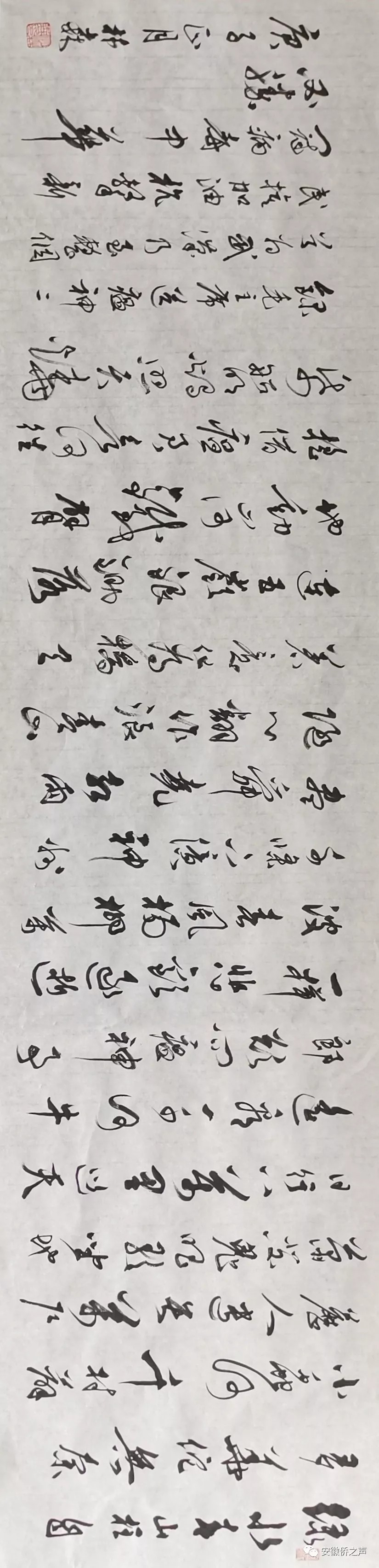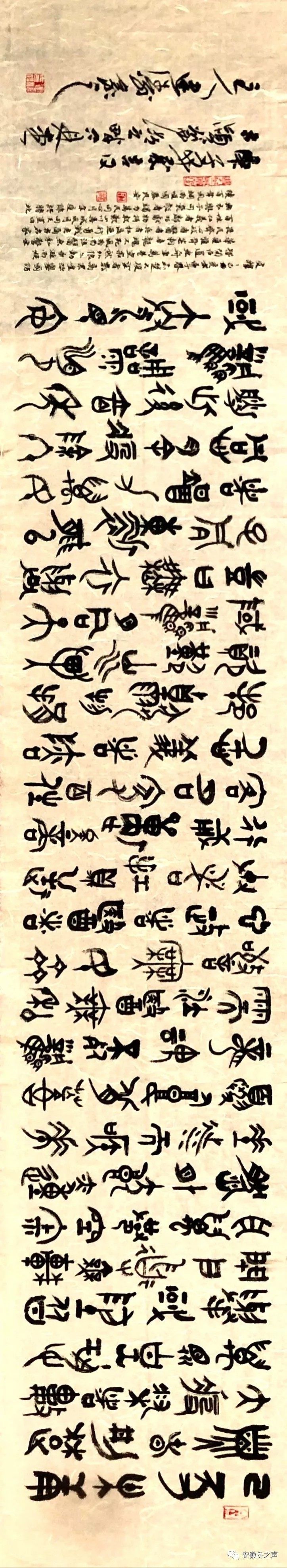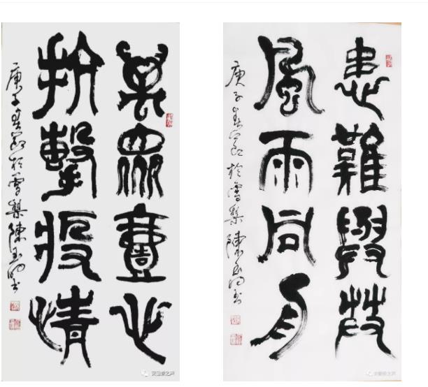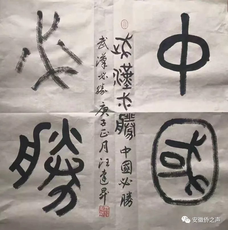 释文:己亥末,庚子春,荆楚大疫,染者数万,众惶恐,举国防,皆闭户,道无舟车,万巷空寂。然外狼亦动,垂涎而候,华夏腹背芒刺。幸龙魂不死,风雨而立。医无私,警无畏,民同心。政者,医者,兵者,扛鼎逆行勇战矣。商客,名家,百姓,仁义者,邻邦献物捐款。叹山川异域,风月同天,岂曰无衣,与子同裳!能者竭力,万民同心。月余,疫除,终胜。此后百年,风调雨顺,国泰民安。
