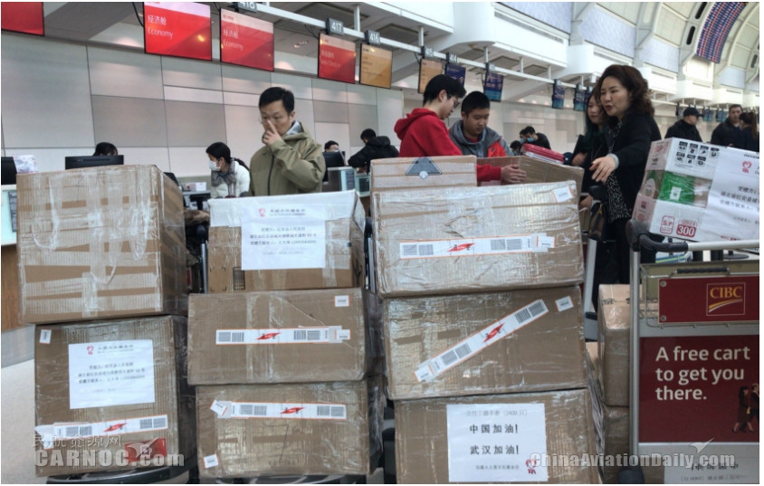 2月17日,海南航空多伦多至北京HU7976航班满载加拿大9家中资企业、华人社团捐赠的约100箱超过1230公斤的抗疫防护物资回国,驰援湖北等省市医院,缓解国内各医院防护物资告急的问题。