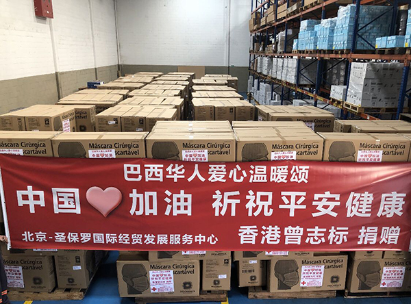 由香港爱心人士曾志标等人捐赠的3915000个医疗口罩已于2月17日圣保罗起程,把这批购来不易(价值143万美元)的捐赠物资送往福建省红十字会、福建省晋江市红十字会、福建省南平市红十字会、厦门市红十字会,完成了巴西华人对祖国人民温暖的祝福及捐赠者共同抗疫的心意。