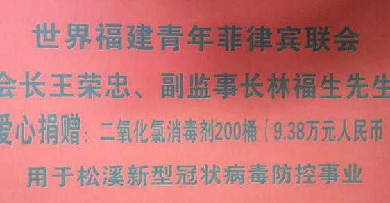 2月16日,世界福建青年菲律宾联会会长王荣忠、副监事长林福生捐赠的200桶无毒环保二氧化氯消毒剂,历经3天千里迢迢运抵松溪,通过松溪县侨联交付县红十字会,用于支持松溪防控新冠肺炎疫情。