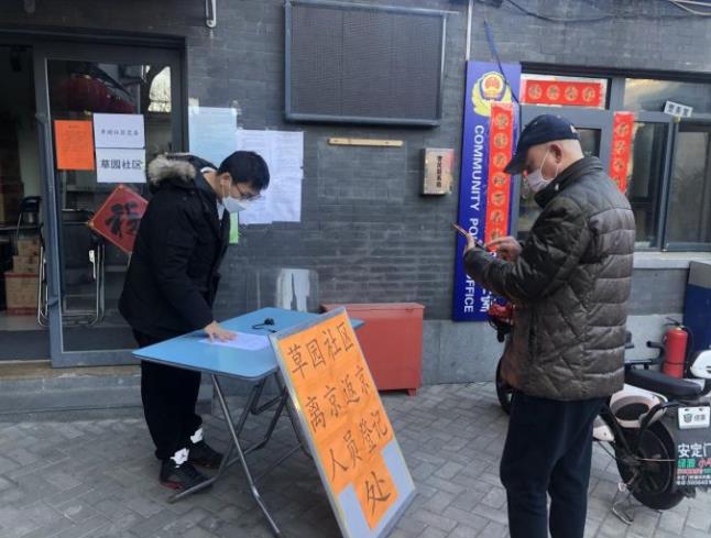 “您好,我们是北新仓居委会,现在做疫情排查,请问您近期是否离京?或者接待过外地来京的亲戚朋友?”