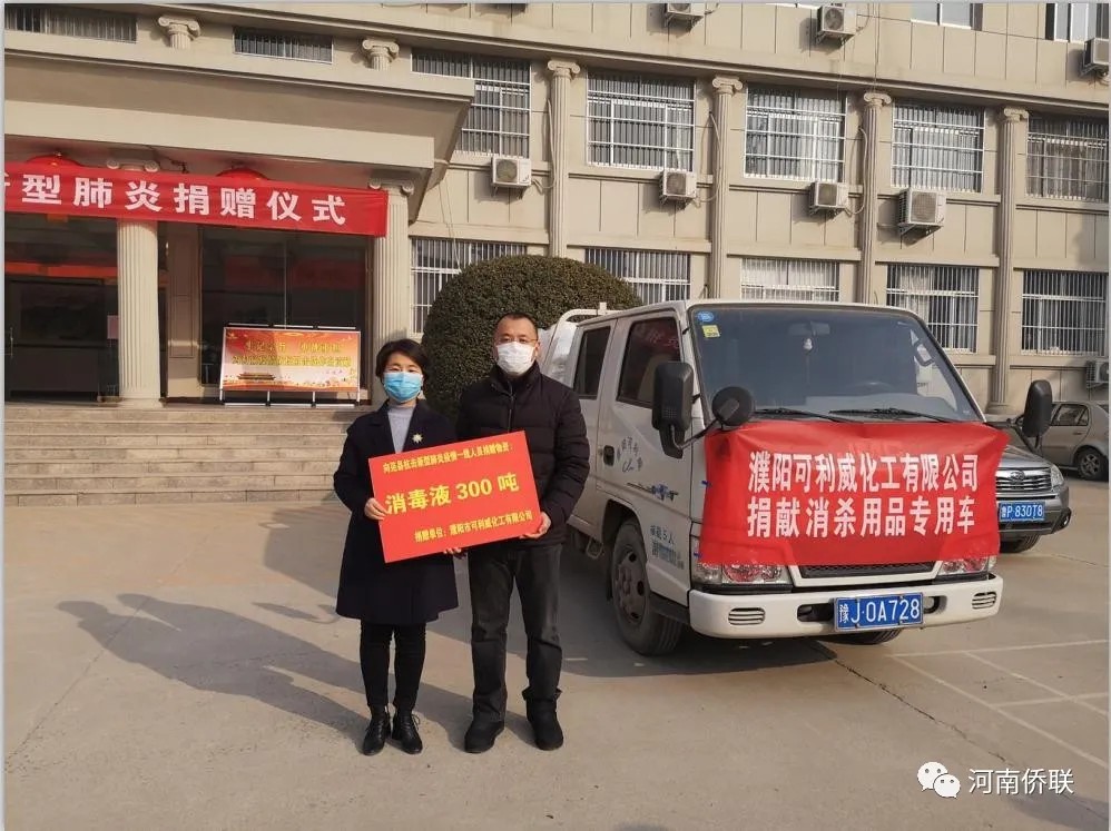濮阳市侨联副主席、市侨商会常务副会长、濮阳可利威化工有限公司董事长张伟中表示,疫情不结束,支援不停止!公司将全力以赴组织生产供应,并保证产品不涨价、不囤积,力保不断货、不压货,以实际行动支持和援助疫情防控工作。