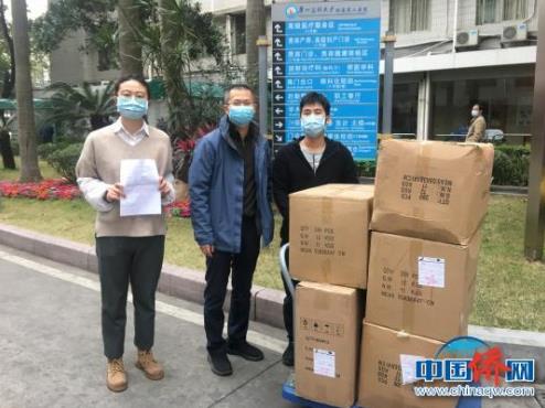 2月1日,广东省侨心慈善基金会理事长杨昀(右)向广东省慈善总会常务副会长兼秘书长钟晓明(左)捐赠菲律宾侨胞从海外募集的防护物资 受访者提供 摄