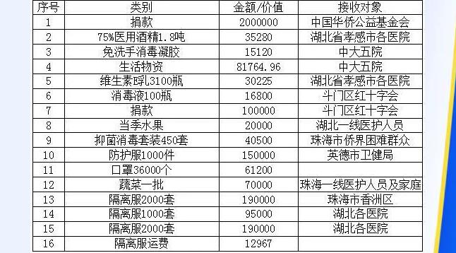 为加强“抗击新型肺炎”捐赠资金收支信息的公开、透明,根据《广东省天行健慈善基金会新型冠状病毒感染的肺炎疫情防控社会捐助工作管理暂行规定》,现对接收的捐赠款物收支情况予以公布,接受社会各界监督。