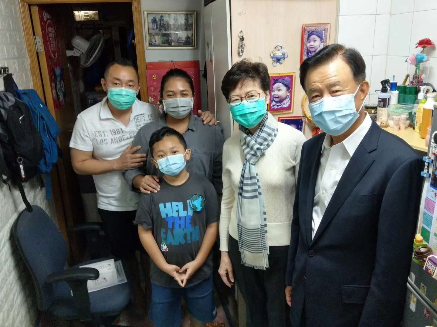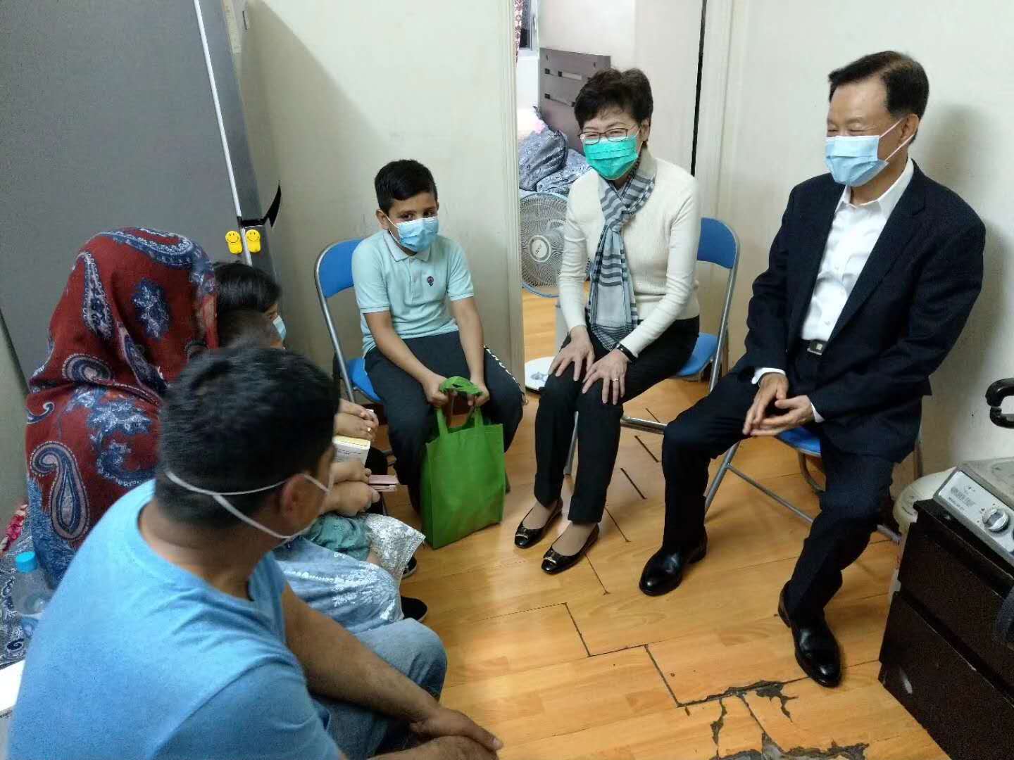 3月1日傍晚,香港特别行政区行政长官林郑月娥参与新家园协会在香港油尖旺社区探访少数族裔家庭的活动,中国侨商联合会会长、新家园协会董事会主席、世茂集团董事局主席许荣茂陪同,一起探访了数户少数族裔基层家庭,了解他们生活受疫情影响的情况,并派发口罩等抗疫物资,呼吁不分种族,助力打赢“抗疫攻坚战”。