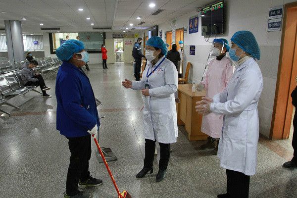 王丽辉(右二)陪上级专家督查本院发热门诊工作