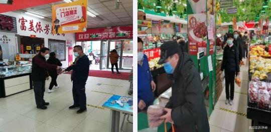 为了防止疫情输入,超市采取人员限流举措,并安排专职人员进行顾客疏导和解释工作;对进店的每一位顾客进行体温测量,体温合格并且带口罩方可入内;为进店顾客设置一米线,引导顾客排队时保持安全距离;店内每日彻底清扫和严格消毒,包括购物车筐、电子秤、收款台等,做到全覆盖。