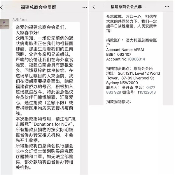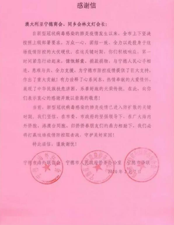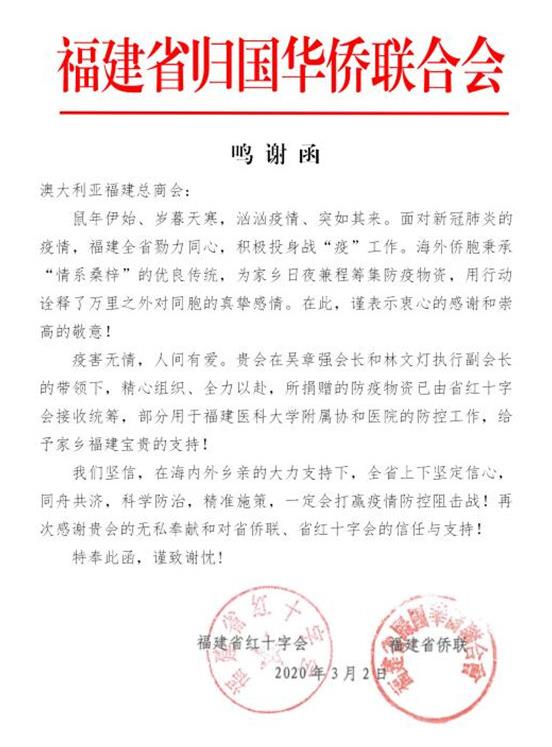 新冠肺炎疫情暴发以来,远在万里之外的澳大利亚福建总商会闽籍侨胞们情系桑梓,响应号召,短短几天时间就捐款3万多美元,并踊跃捐赠了一大批口罩、防护服等医疗物资,和家乡人民同甘苦、共患难,奏响了一首大爱的乐章。