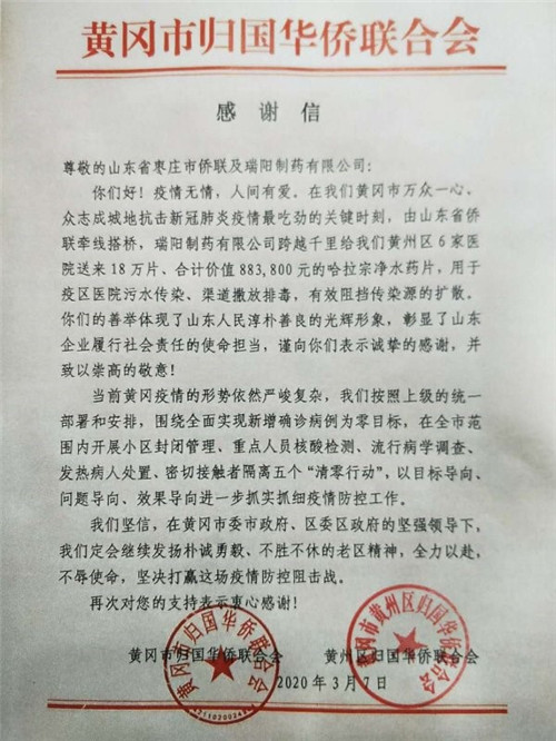 经枣庄市侨联牵线搭桥,瑞阳制药有限公司向黄冈市黄州区6家医院捐赠价值近90万元的哈拉宗净水药18万片,用于医院疫区污水消毒。3月7日,物资已运抵黄冈,助力黄冈市抗击疫情。