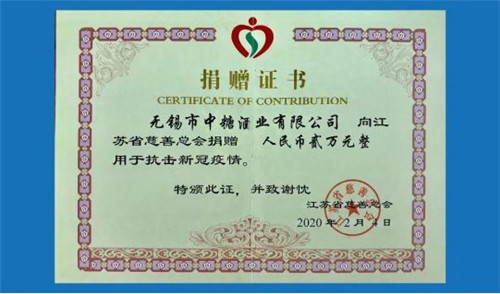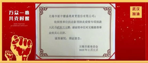 截止发稿时,无锡新中糖向无锡市新冠肺炎防疫指挥部捐赠20万元,向江苏省慈善总会捐赠2万元,向湖北省慈善总会捐赠3万元,用于抗击新冠肺炎疫情。
