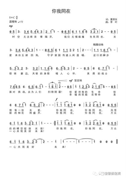 歌曲《你我同在》由夏捍东作词,李叶作曲,徐兴民编曲,大家齐心协力,共同完成了这首原创作品。希望用自己的心声为社会传递正能量,为时代唱响最强音,展现了安徽人民群众抗击疫情的无畏精神和大爱情怀,激励人们坚定必胜信心、振奋精神,号召亿万同胞万众一心、勇于担当,你我同在,战“疫”必胜!《你我同在》的多位演唱者及制作团队,曾多次参与中国侨联、安徽省侨联“亲情中华”海外慰问演出、下侨乡公益活动和省侨联、省歌曲剧院联合开展的送文化进基层活动,深受海内外侨界和广大侨乡群众的欢迎。