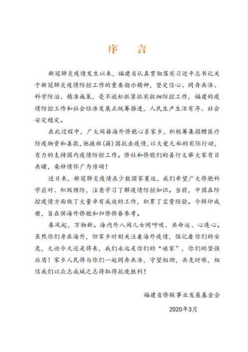 福建省侨联编制《防疫知识手册》 支援海外抗疫