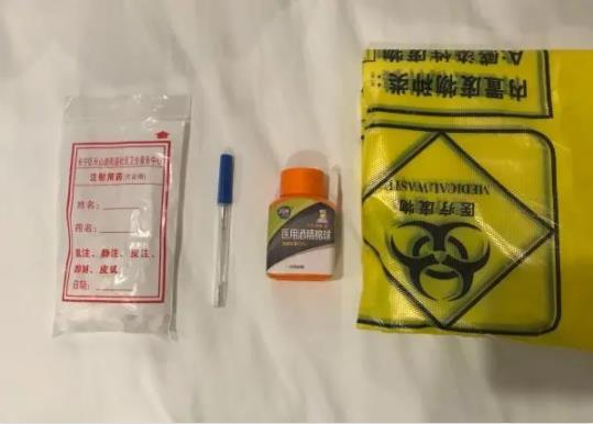 入住当晚,酒店还给从国外回来的旅客发放了生活用品包,五个医疗废物包装袋,体温计,消毒药片,酒精棉球……里面的消毒品一应俱全。