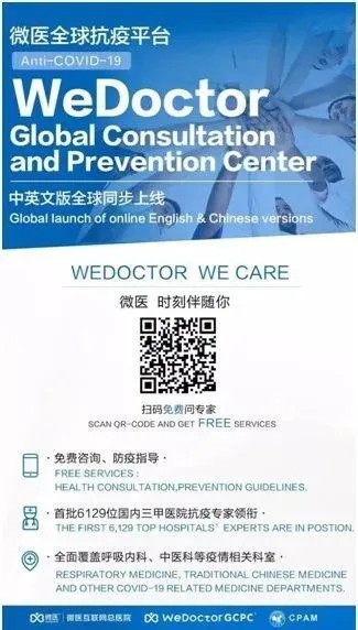 可关注“微医健康”公众号,点击底部“实时疫情-海外疫情救助”,或扫描下图二维码,即可进入“微医互联网总医院全球抗疫平台”服务页面,内有防疫科普知识、“免费咨询华人医生”“海外同胞心理咨询通道”等专区。服务时间为24小时。
